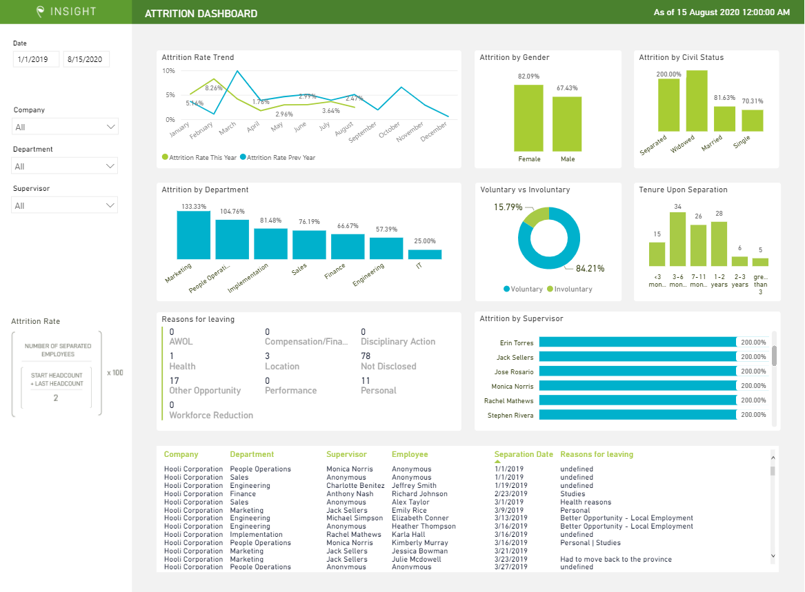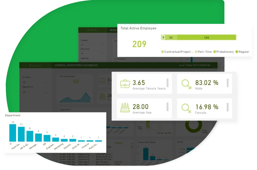 - General Workforce dashboard gives you an overview of your organization’s geodemographics from average age and tenure to age, gender, and civil status distribution.