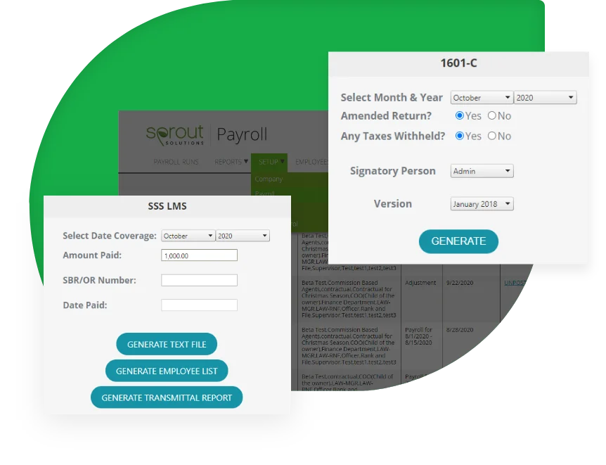 - Sprout Payroll can quickly generate various government forms: SSS, Philhealth, PAG-IBIG, BIR, Certificate of Contribution, Certificate of Loan.
